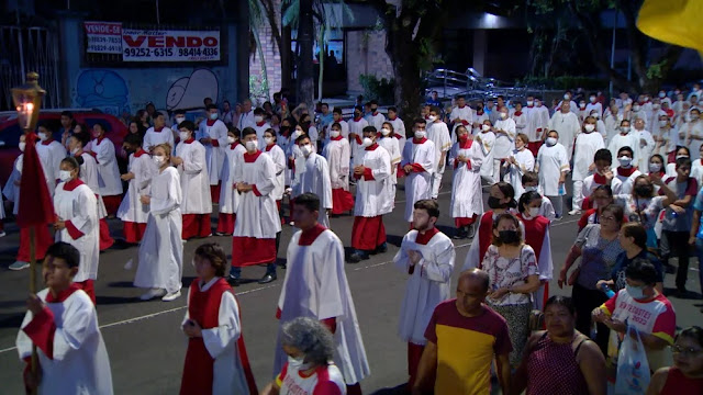 A procissão de Corpus Christi em Manaus saiu da avenida Eduardo Ribeiro e percorreu as avenidas 7 de Setembro e Joaquim Nabuco, onde os fies lembraram os momentos mais difíceis da pandemia e pararam pra rezar pelas pessoas doentes que estão internadas em um hospital da localidade.