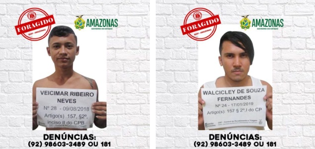 A Secretaria de Administração Penitenciária (Seap) divulgou, nesta sexta-feira (20), fotos dos detentos Veicimar Ribeiro Neves e Walcicley de Souza Fernandes que fugiram durante uma transferência de presídio em Manaus.