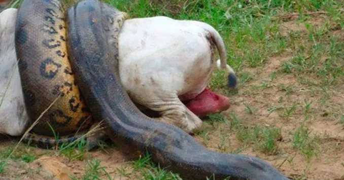 Estômago de píton não aguenta vaca inteira e rasga; veja vídeo