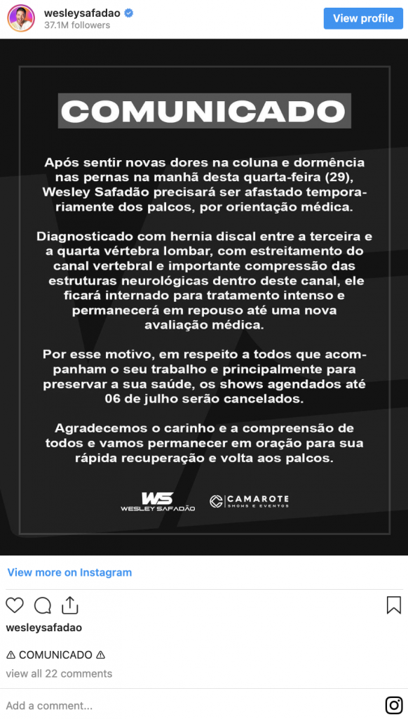 “Após sentir novas dores na coluna e dormência nas pernas na manhã desta quarta-feira (29), Wesley Safadão precisará ser afastado temporariamente dos palcos, por orientação médica”, diz a nova nota.