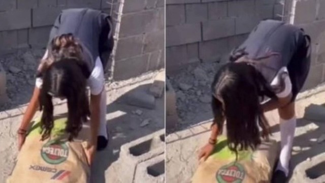 Até que o seu pai interveio e levou a menina, usando uniforme escolar, para o canteiro de obra onde ele trabalha, no México.